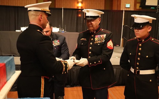 The Marine Corps birthday cake-cutting ceremony is an important part of the birthday ball. The cake is cut with the Mameluke sword, which officers carry. The first piece of cake is given to the guest of honor. Traditionally, the second piece is given to the oldest Marine and the third to the youngest, signifying the passing of experience and knowledge.