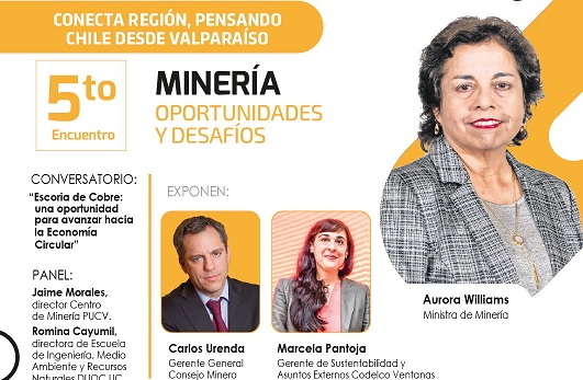 Tras las exposiciones se realizará el conversatorio «Escoria de Cobre: una oportunidad para avanzar hacia la Economía Circular», donde participarán Jaime Morales, director del Centro de Minería PUCV y Romina Cayumil, directora de la Escuela de Ingeniería Medio Ambiente y Recursos Naturales Duoc UC. El diálogo, será moderado por el director de El Mercurio de Valparaíso, Carlos Vergara.