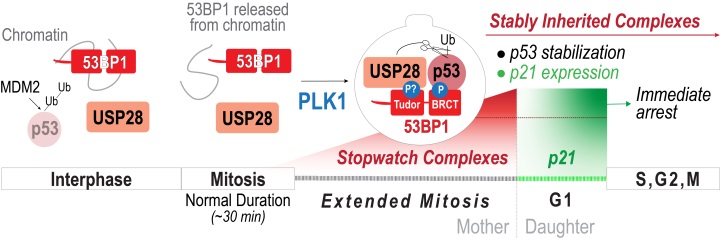 The Mitotic Stopwatch Complex consists of 3 proteins: p53 binding protein 1, USP28 and p53 protein itself. These proteins only interact during unusually longer mitosis (longer than 30 minutes). During this prolonged mitosis, more and more of the complex is formed. The more complex formed, the stronger the result – this could either be cell arrest or cell death, depending on the cell type.