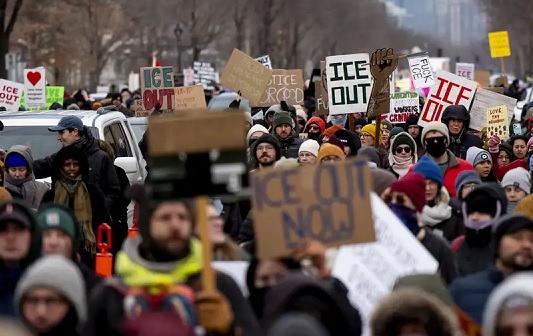Mineápolis, 11 de Enero de 2026.- Miles de manifestantes salieron este sábado a las calles en Estados Unidos para protestar contra el Servicio de Inmigración y Control de Aduanas (ICE), que causó indignación en la población luego de que uno de sus agentes abatiera a una mujer de 37 años durante una redada contra migrantes en Mineápolis.