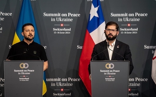 Bürgenstock, 17 de Junio de 2024.- Luego de dos jornadas de trabajo y discusión, el domingo 16 de junio se dio término a la Cumbre para la Paz en Ucrania, instancia co-organizada por Ucrania y Suiza, y realizada en la localidad de Bürgenstock, en la ciudad suiza de Lucerna. Es por ello que, luego de que en la plenaria de cierre los asistentes acordaran una declaración conjunta, se determinó que los mandatarios de cuatro países, además de los co-organizadores, acompañarían la declaración final a la prensa: el Presidente de la República de Chile, Gabriel Boric Font; el Presidente de Ghana, Nana Akufo-Addo; el Primer Ministro de Canadá, Justin Trudeau; y la Presidenta de la Comisión Europea, Ursula von der Leyen.
