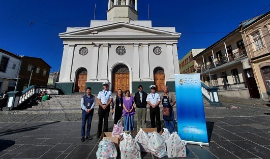 Valparaíso, 22 de Diciembre de 2025.- En el marco de la campaña solidaria permanente que desarrolla la Iglesia La Matriz de Valparaíso, iniciativa que brinda ayuda directa a más de 300 personas en condición de calle que diariamente acuden a esta histórica congregación porteña, durante la mañana del lunes 22 de diciembre parte del equipo del Museo Marítimo Nacional (MMN), encabezado por su Jefe Militar, Teniente Primero OM Humberto Amigo, concurrió hasta sus dependencias para hacer entrega de una importante donación consistente en más de 800 útiles de aseo personal.